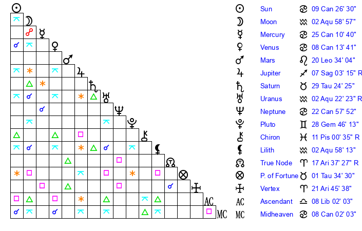 | Neptune | 22 Cancer 58 | 2 Aries 10 | 26 Cancer 0 |