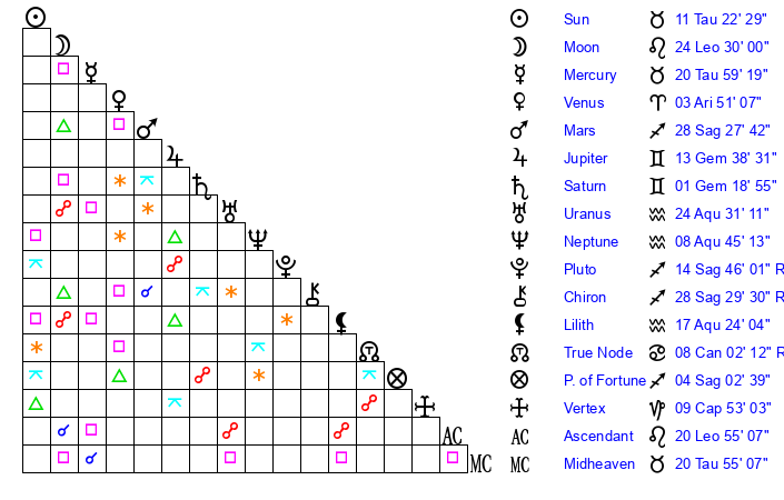 | Sun | 11 Taurus 23 | 11 Taurus 34 | 4 Gemini 33 |