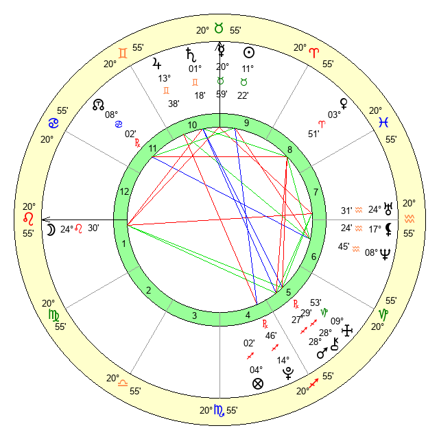 | Moon | 24 Leo 37 | 5 Cancer 46 | 8 Cancer 31 |