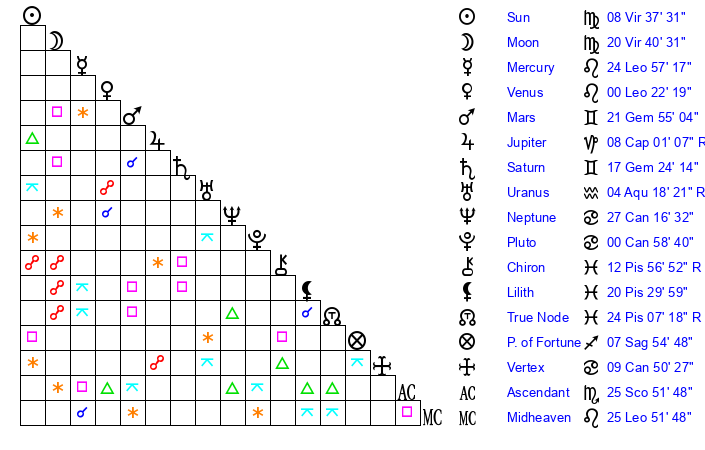 | Mercury | 24 Leo 57 | 28 Leo 23 | 12 Sagittarius 11 |