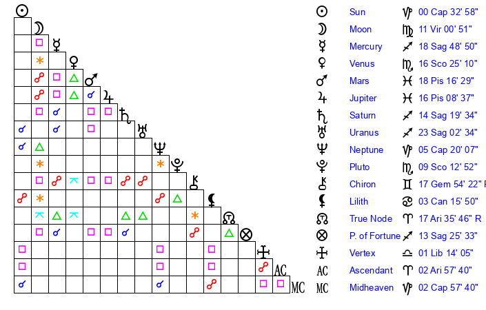 | Sun | 0 Capricorn 33 | 1 Capricorn 21 | 9 Aquarius 15 |