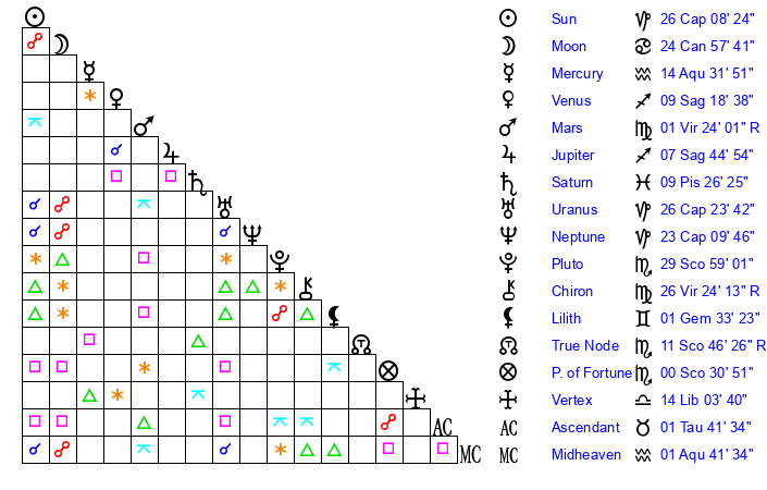 Mercury | 14 Aquarius 31 | 12 Capricorn 13 | 5 Aquarius 37 |