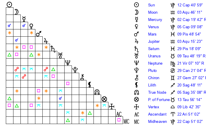 | Mercury | 2 Capricorn 19 | 2 Capricorn 48 | 0 Taurus 9 |