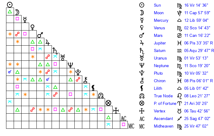 | Pluto | 10 Virgo 6 | 1 Aquarius 37 | 11 Virgo 52 |