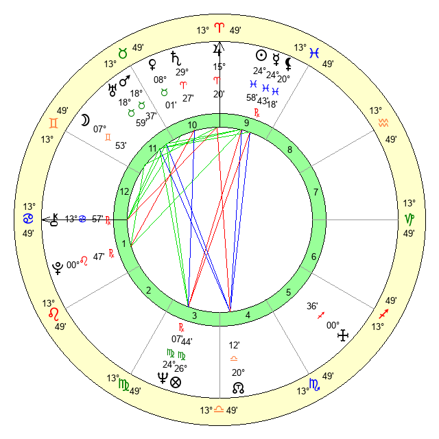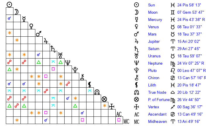| Sun | 24 Pisces 58 | 25 Pisces 22 | 17 Gemini 43 |