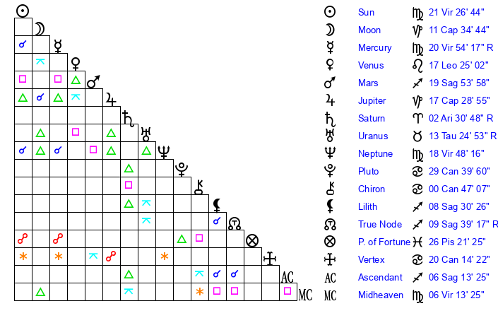 | Sun | 21 Virgo 26 | 22 Virgo 8 | 19 Sagittarius 15 |