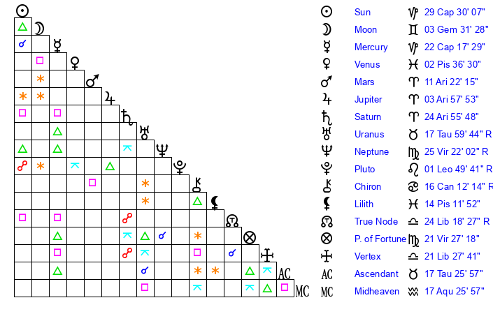 | Sun | 29 Capricorn 30 | 0 Aquarius 53 | 24 Aries 35 |