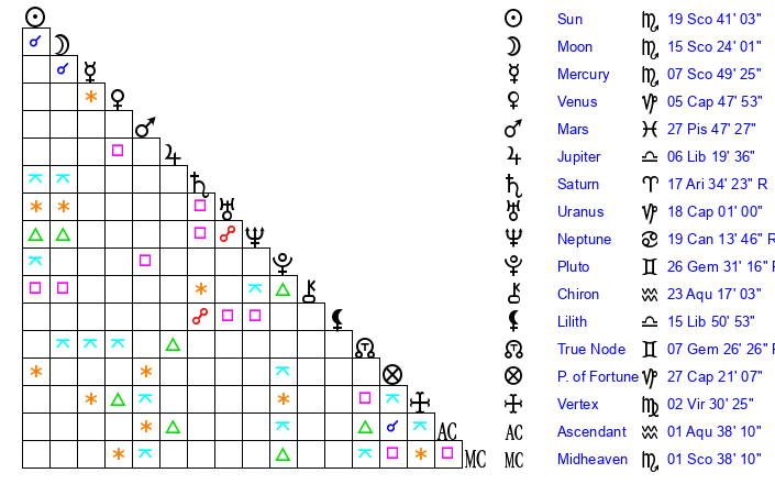 | Sun | 19 Scorpio 41 | 20 Scorpio 34 | 17 Pisces 15 |