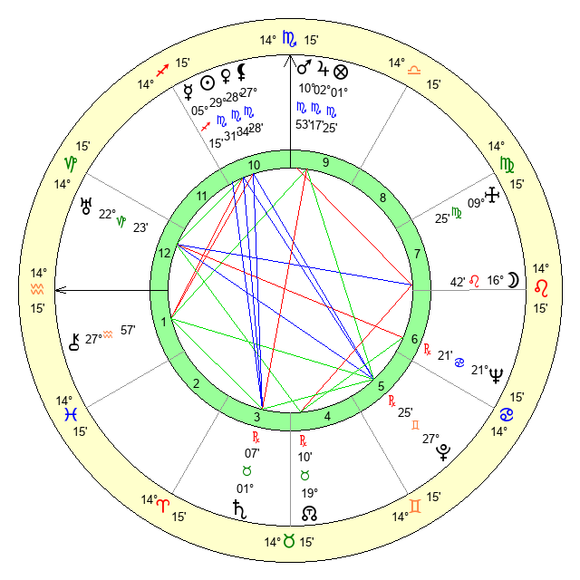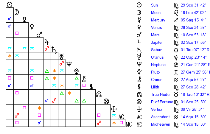 | Moon | 16 Leo 40 | 27 Sagittarius 9 | 27 Libra 40 |