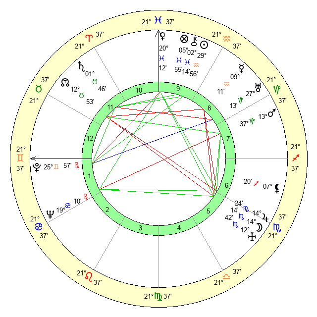 | Sun | 29 Aquarius 57 | 1 Pisces 18 | 21 Gemini 33 |