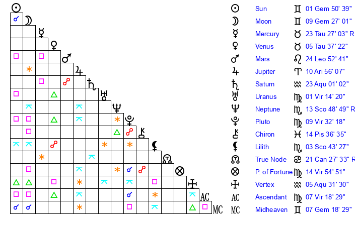 | Moon | 9 Gemini 27 | 14 Aries 51 | 18 Virgo 8 |