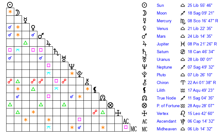 | Moon | 18 Sagittarius 13 | 6 Libra 28 | 29 Libra 14 |