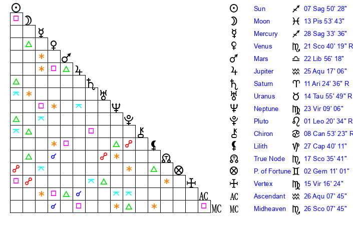 | Sun | 7 Sagittarius 50 | 8 Sagittarius 44 | 6 Pisces 12 |