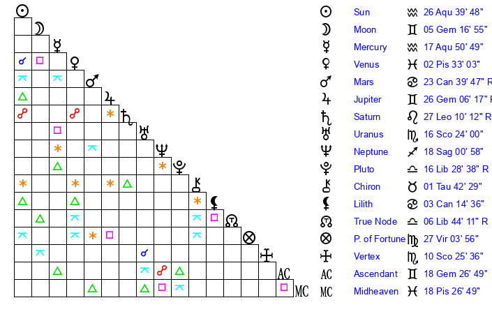 | Mercury | 17 Aquarius 51 | 2 Pisces 13 | 25 Aries 54 |