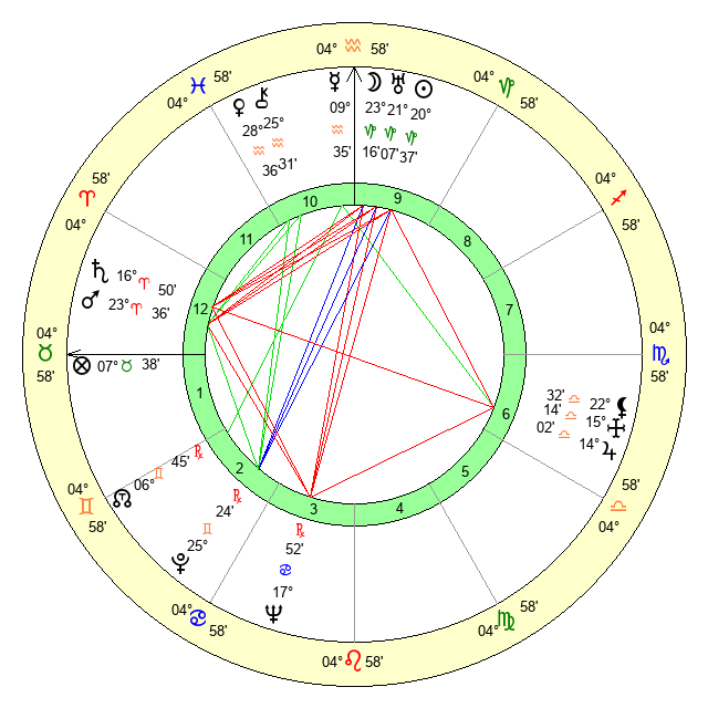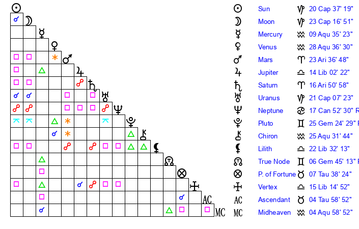 | Moon | 23 Capricorn 18 | 23 Gemini 27 | 9 Aries 38 |