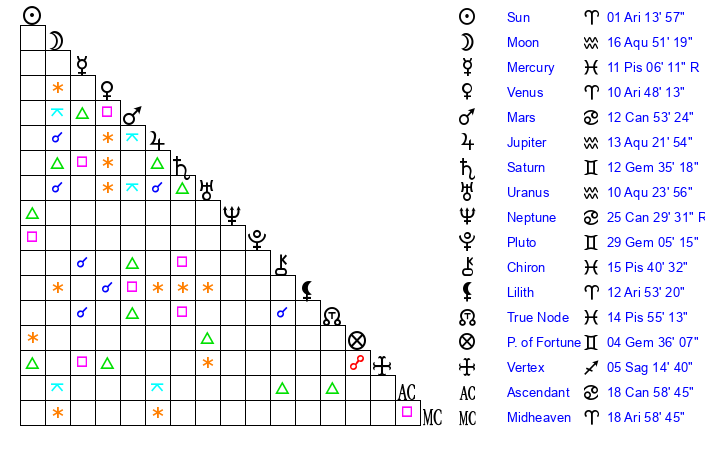 | Jupiter | 13 Aquarius 7 | 14 Gemini 37 | 20 Aquarius 32 |