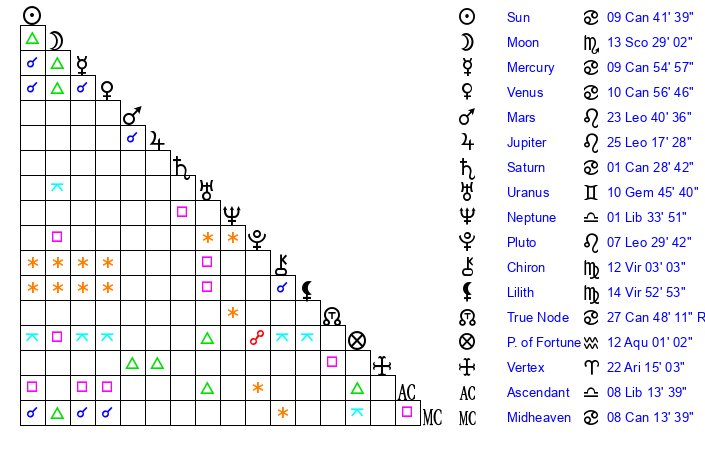 | Mercury | 9 Cancer 56 | 5 Leo 53 | 10 Virgo 4 |