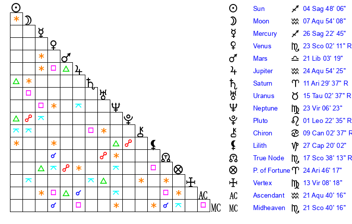 | Moon | 7 Aquarius 57 | 28 Aquarius 44 | 10 Aries 38 |