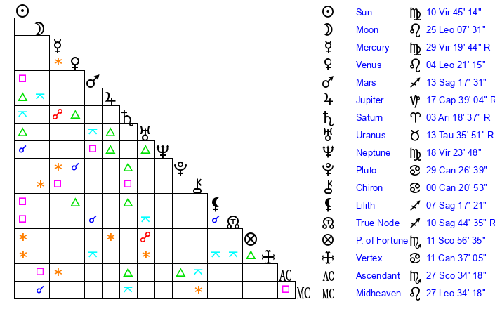 | Mercury | 29 Virgo 19 | 2 Virgo 12 | 25 Sagittarius 21 |