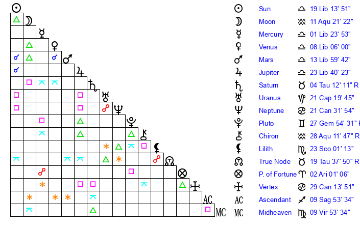 | Sun | 19 Libra 14 | 20 Libra 22 | 15 Aquarius 32 |
