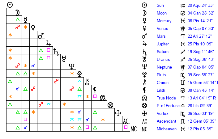 | Moon | 4 Cancer 25 | 16 Cancer 46 | 19 Scorpio 54 |