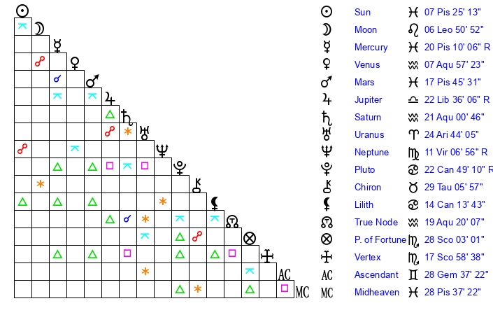 | Sun | 7 Pisces 25 | 8 Pisces 21 | 6 Gemini 39 |