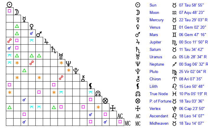| Moon | 7 Aquarius 49 | 21 Taurus 28 | 14 Aquarius 37 |