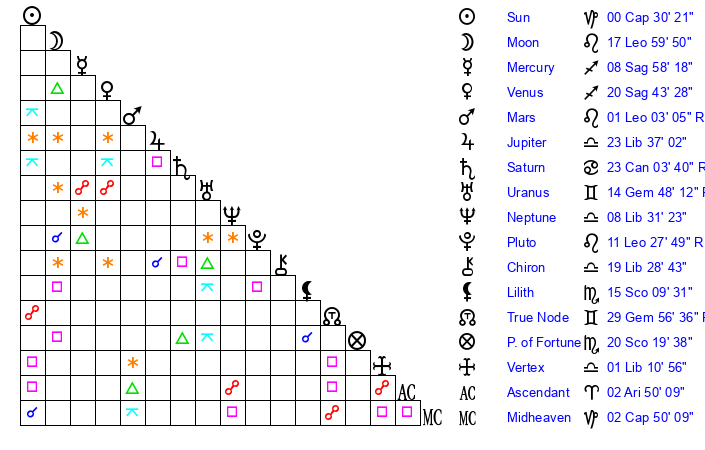 | Sun | 0 Capricorn 30 | 1 Capricorn 6 | 21 Pisces 31 |