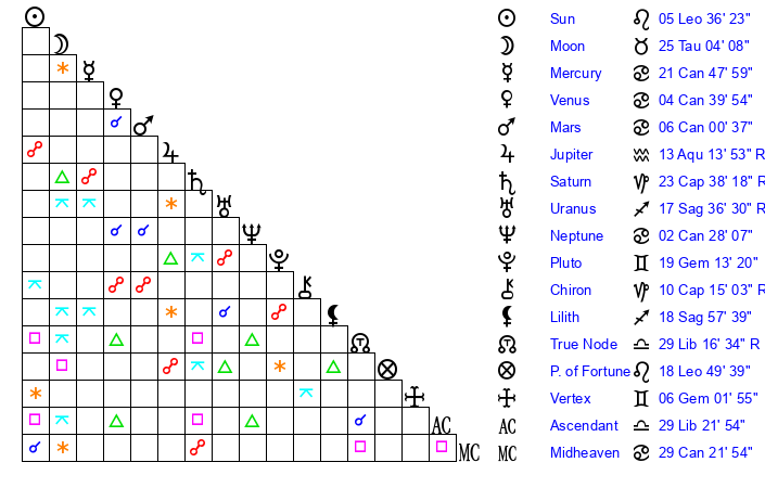 | Moon | 25 Taurus 0 | 5 Libra 49 | 2 Sagittarius 20 |