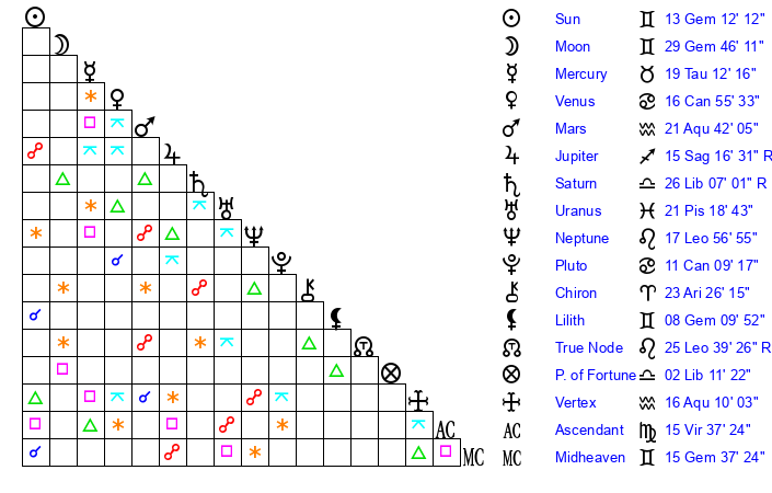 | Jupiter | 15 Sagittarius 0 | 28 Gemini 42 | 11 Sagittarius 52 |
