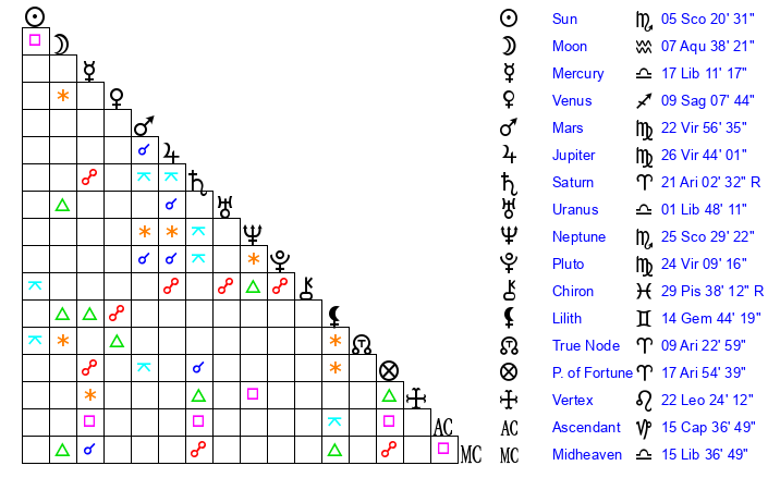 | Sun | 5 Scorpio 20 | 5 Scorpio 31 | 2 Capricorn 58 |