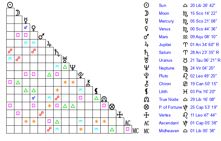| Sun | 20 Libra 26 | 21 Libra 36 | 17 Capricorn 17 |