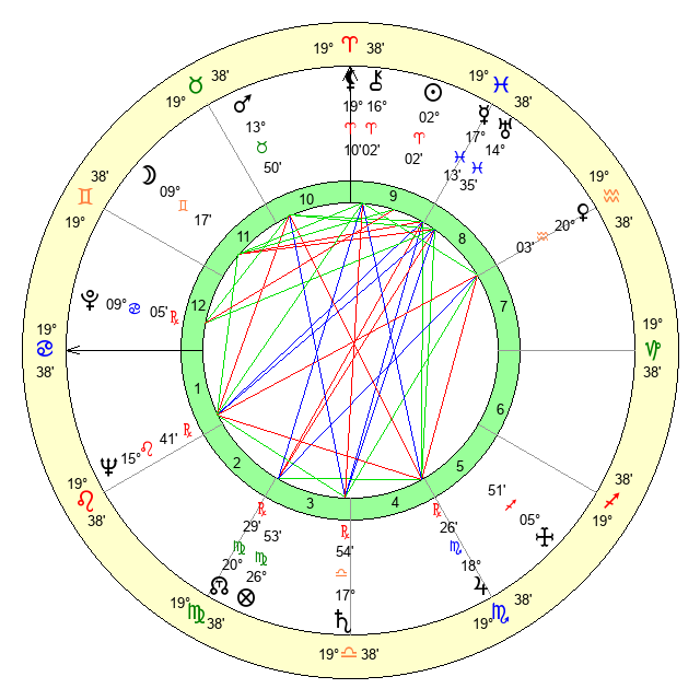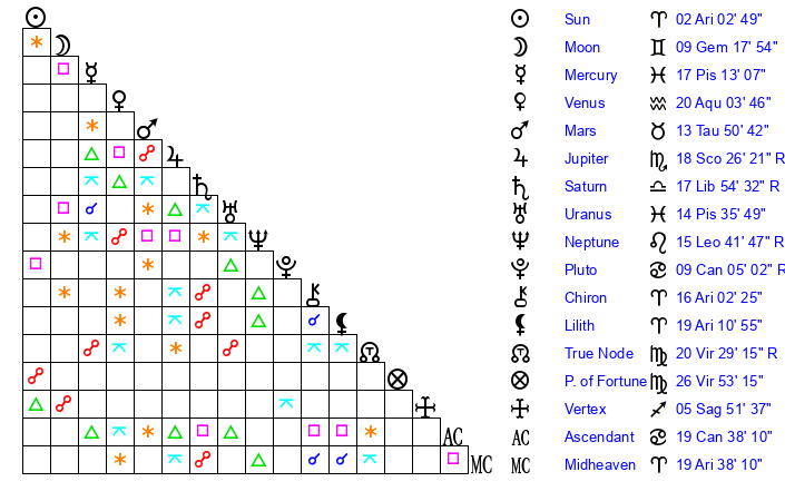 | Sun | 2 Aries 2 | 3 Aries 19 | 10 Cancer 43 |