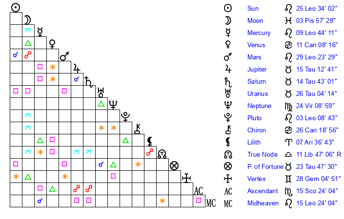 | Sun | 25 Leo 34 | 26 Leo 0 | 19 Scorpio 10 |