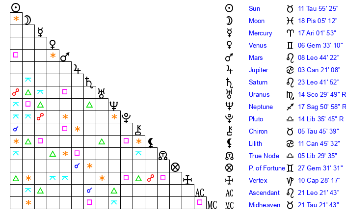 | Moon | 18 Pisces 2 | 19 Cancer 42 | 26 Scorpio 55 |