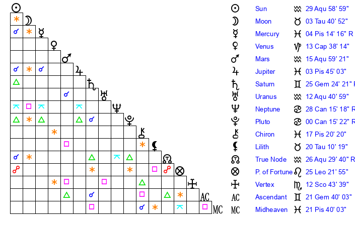 | Sun | 29 Aquarius 59 | 1 Pisces 18 | 17 Gemini 45 |