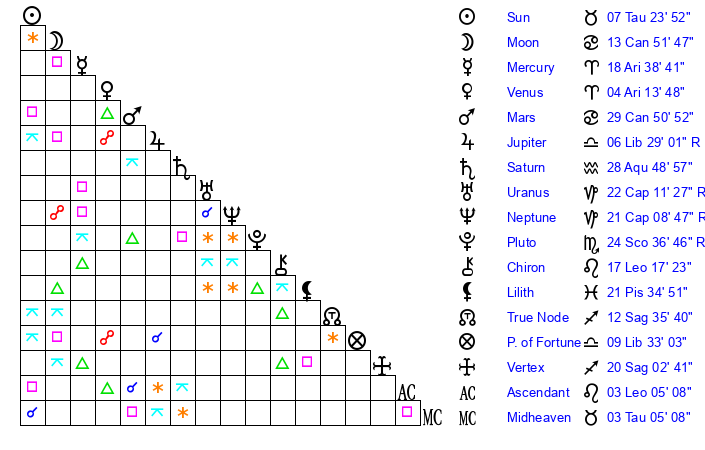 Moon | 13 Cancer 55 | 5 Taurus 37 | 20 Virgo 19 |