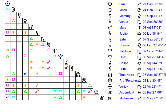 Sun | 27 Sagittarius 50 | 28 Sagittarius 20 | 6 Pisces 52 |