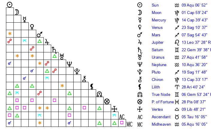 Moon | 2 Capricorn 0 | 8 Aquarius 51 | 18 Libra 14 |
