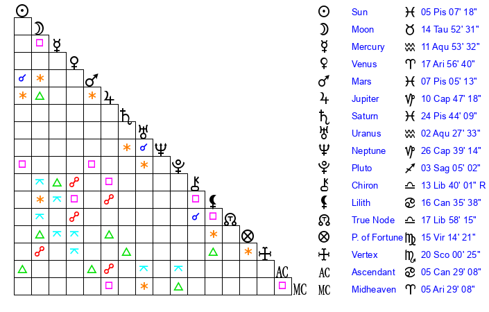 | Sun | 5 Pisces 7 | 6 Pisces 5 | 4 Aries 5 |