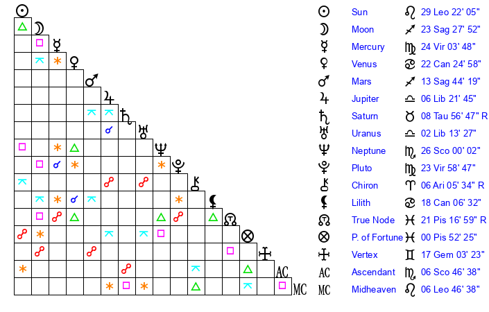 | Moon | 23 Sagittarius 26 | 22 Leo 31 | 14 Capricorn 55 |