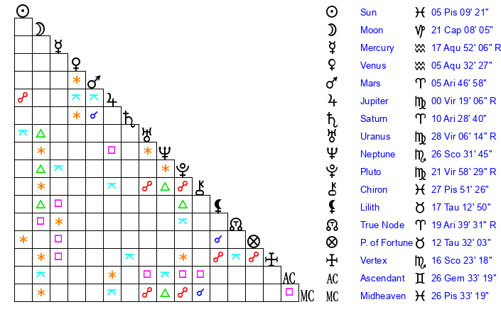 | Mercury | 17 Aquarius 52 | 18 Pisces 51 | 27 Aries 59 |