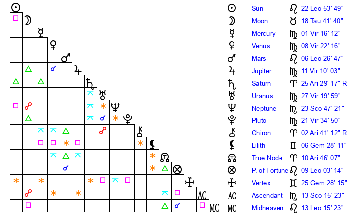 | Moon | 18 Taurus 44 | 16 Taurus 15 | 16 Gemini 28 |