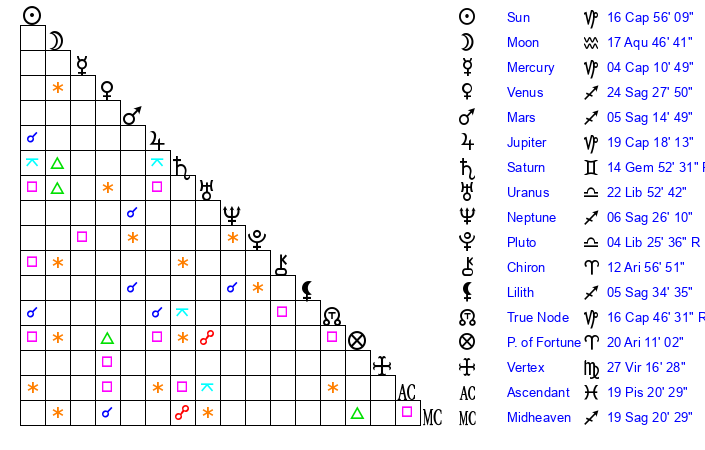 Moon | 17 Aquarius 51 | 22 Aries 17 | 14 Capricorn 52 |