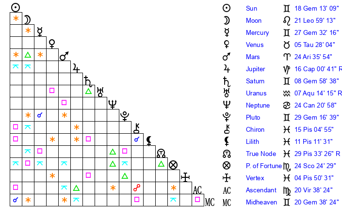 | Sun | 18 Gemini 13 | 19 Gemini 6 | 5 Libra 56 |