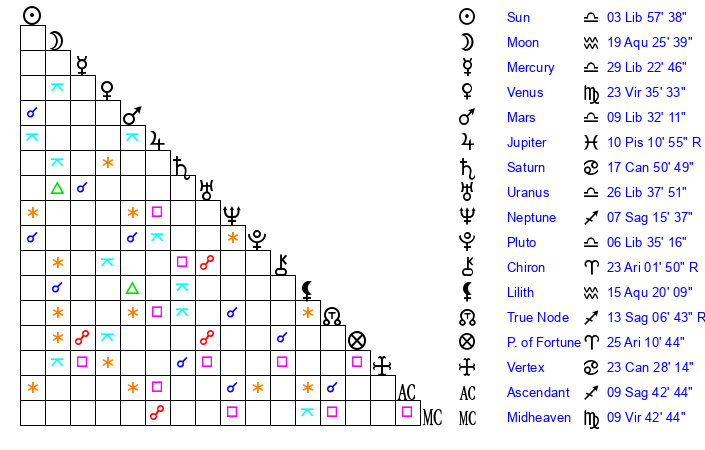Moon | 19 Aquarius 28 | 6 Sagittarius 39 | 5 Capricorn 21 |