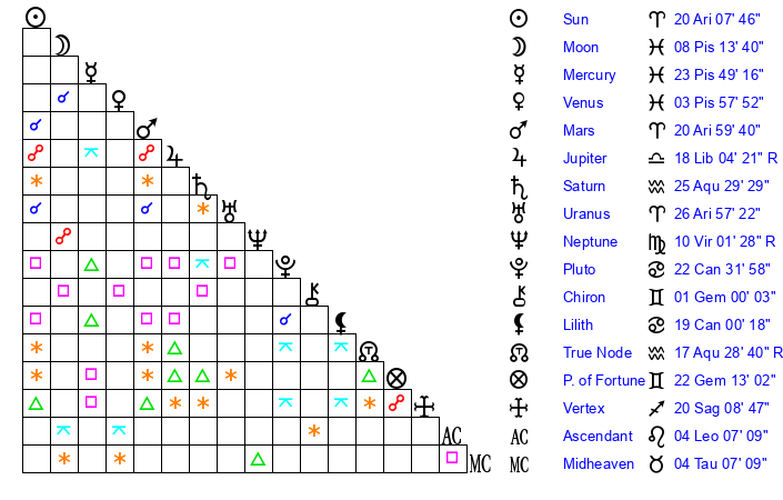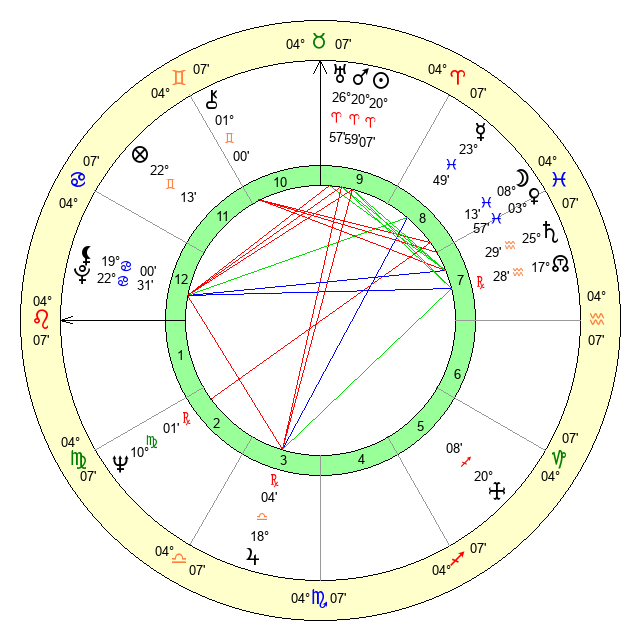 | Sun | 20 Aries 8 | 21 Aries 4 | 17 Cancer 43 |