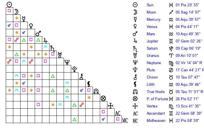 | Sun | 1 Pisces 21 | 2 Pisces 18 | 4 Gemini 42 |
