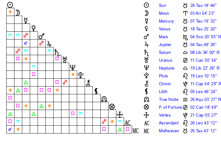 | Mercury | 7 Taurus 19 | 16 Taurus 13 | 27 Leo 3 |