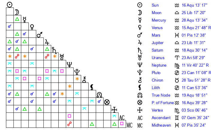 | Saturn | 18 Aquarius 40 | 17 Pisces 52 | 27 Aquarius 30 |